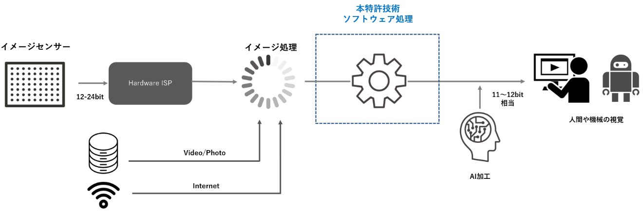 本特許技術は、汎用的なソフトウェアとして、スマートフォン、市販の安価なWebカメラ、流通済のデバイス、半導体及びディスプレイ等において、効率的にデータの視覚向上ができるように意図した、全方位対応可能なクロスプラットフォーム*²としての利用を前提としています。